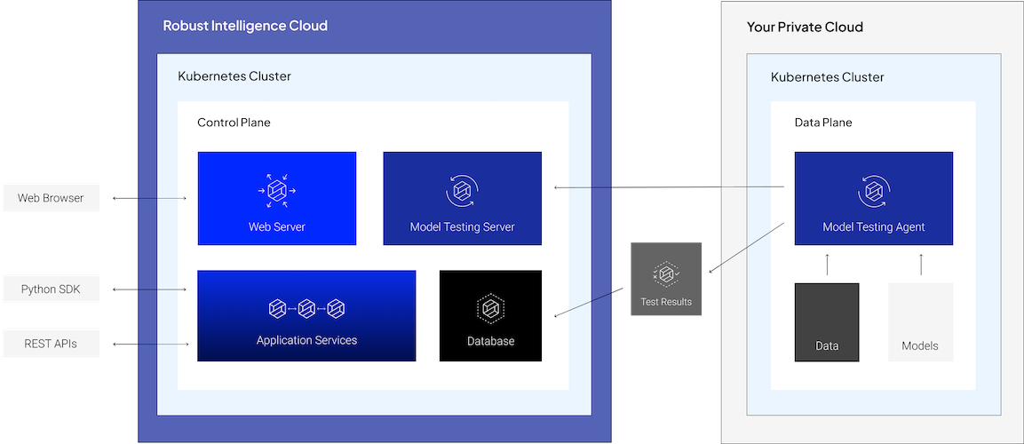 This means that your data and models stay within your organization’s cloud, and you have full control over the compute infrastructure for model testing. Results of these tests are uploaded to the Robust Intelligence cloud, where they are served by a dedicated control plane cluster.