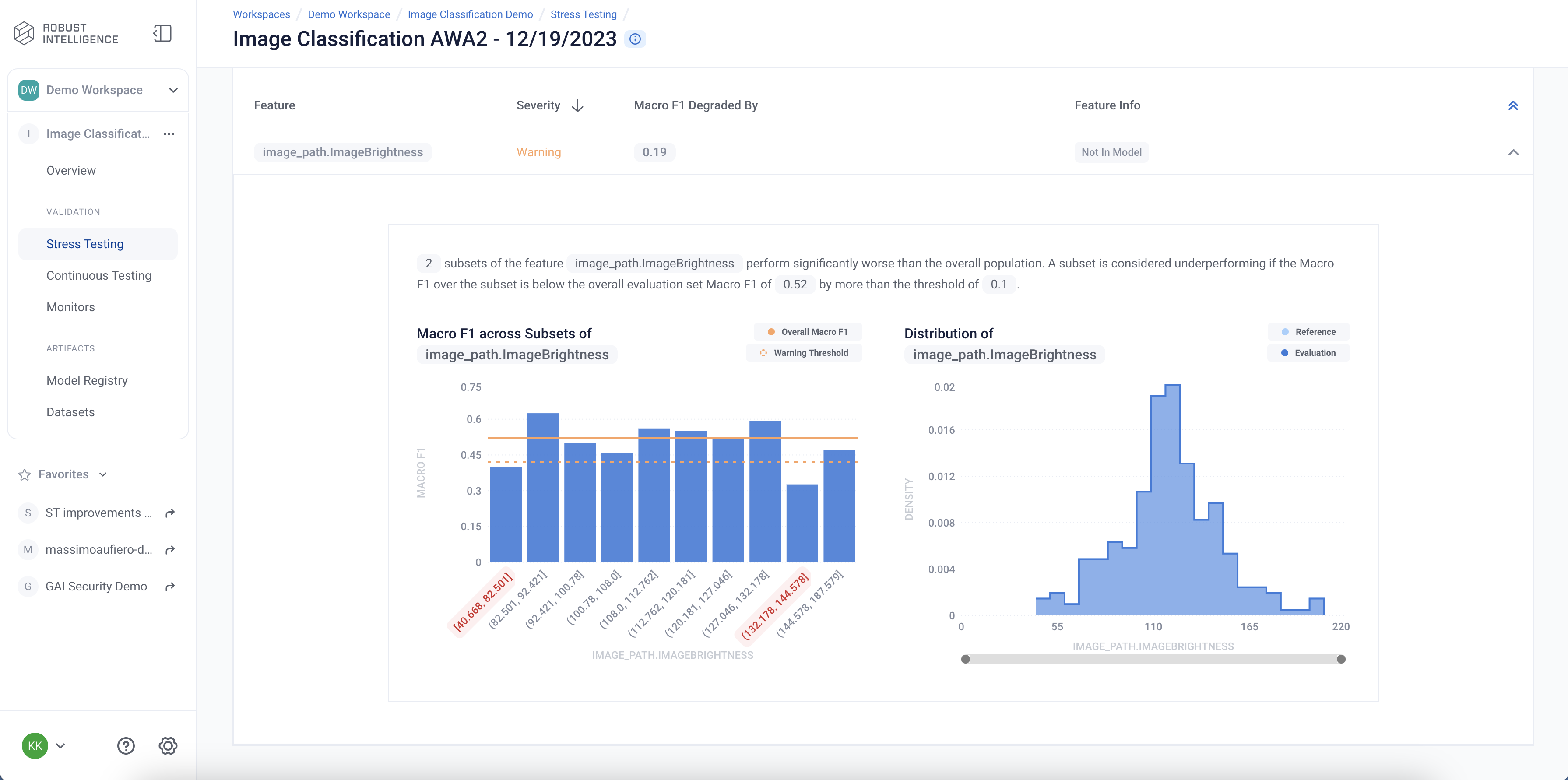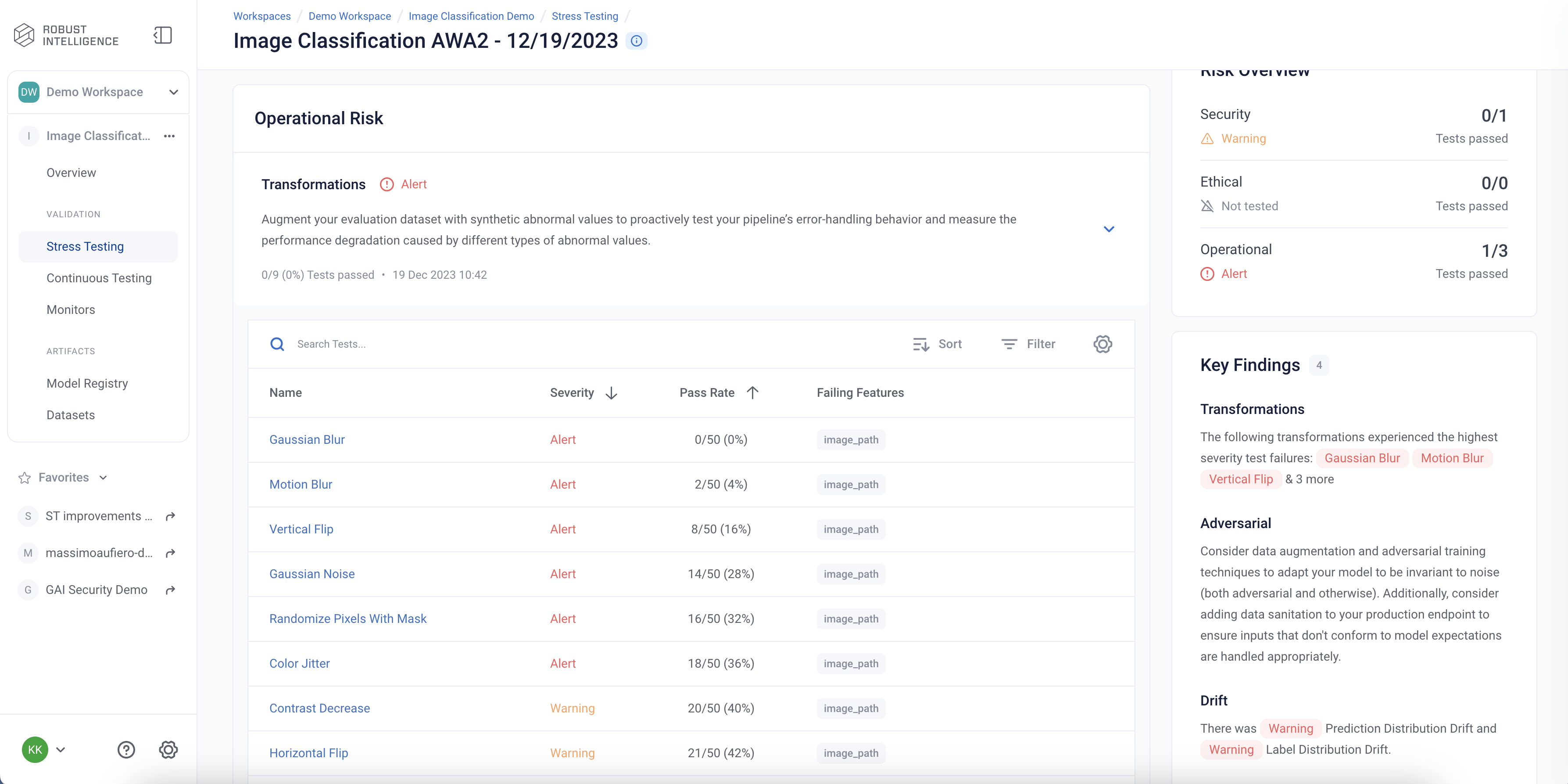 Stress tests are grouped first by risk categories and then into categories that measure various aspects of model robustness (subset performance, distribution drift, adversarial, transformations). Key findings to improve your model are aggregated on the category level as well. Tests are ranked by default by a shared severity metric. Clicking on an individual test surfaces more detailed information.