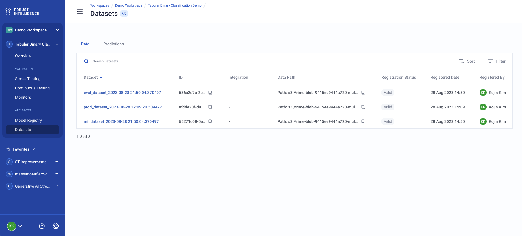 All registered datasets and predictions along with their metadata can be seen on the Robust Intelligence web UI.