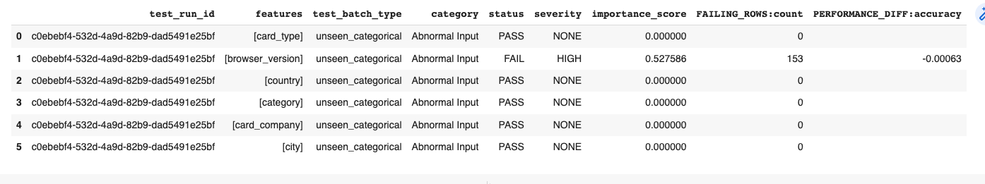 If we want more granularity, we can retrieve all the individual test cases for the given test batch (e.g. the results of unseen categorical over each feature) as a Pandas DataFrame: